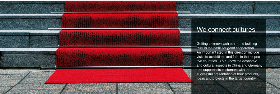 Commerce as well as cultural interchange between China and Germany is growing steadily. This often leads to various conflicts between German and Chinese interest on both sides. 3 & 1 knows the prevailing economic and cultural circumstances in China and Germany and can therefore successfully fulfil mutual interests by carrying out projects which will achieve good results for both parties.
